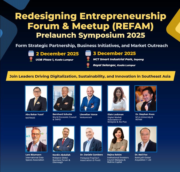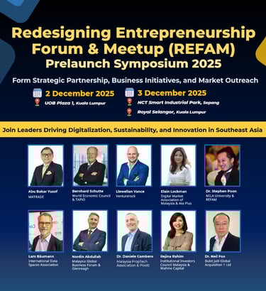 The Redesigning Entrepreneurship Forum & Meetup (REFAM) Prelaunch Symposium 2025 is the premier event shaping the future of business and investment across Malaysia and Southeast Asia. Organized by the Digital Connect Society and the International Data Spaces Association (IDSA) Hub Malaysia, REFAM Prelaunch Symposium 2025 brings together startups, SMEs, investors, policymakers, and international business delegates, creating unparalleled opportunities for networking, business matching, and investment partnerships in the region.